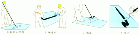 ■ 水平面鋪貼:先在基層面上彈出一條基準線,然后由低向高鋪貼。展開卷材的同時, 揭開隔離紙,沿基準線鋪貼,卷材搭接寬度≥50mm(滿粘),≥60mm(空鋪、點粘、條粘)。鋪貼后應即用橡膠壓輥壓實卷材。